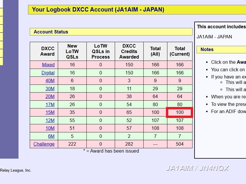 10月16日に10M(28MHz帯)、27日に12M(24MHz帯)でのDXCC達成をご報告したのですが、それからまだ2週間ちょっとしか経っていない本日、LoTWを覗いてみたら15M(21MHz帯)でのDXCC100を無事に達成していました。