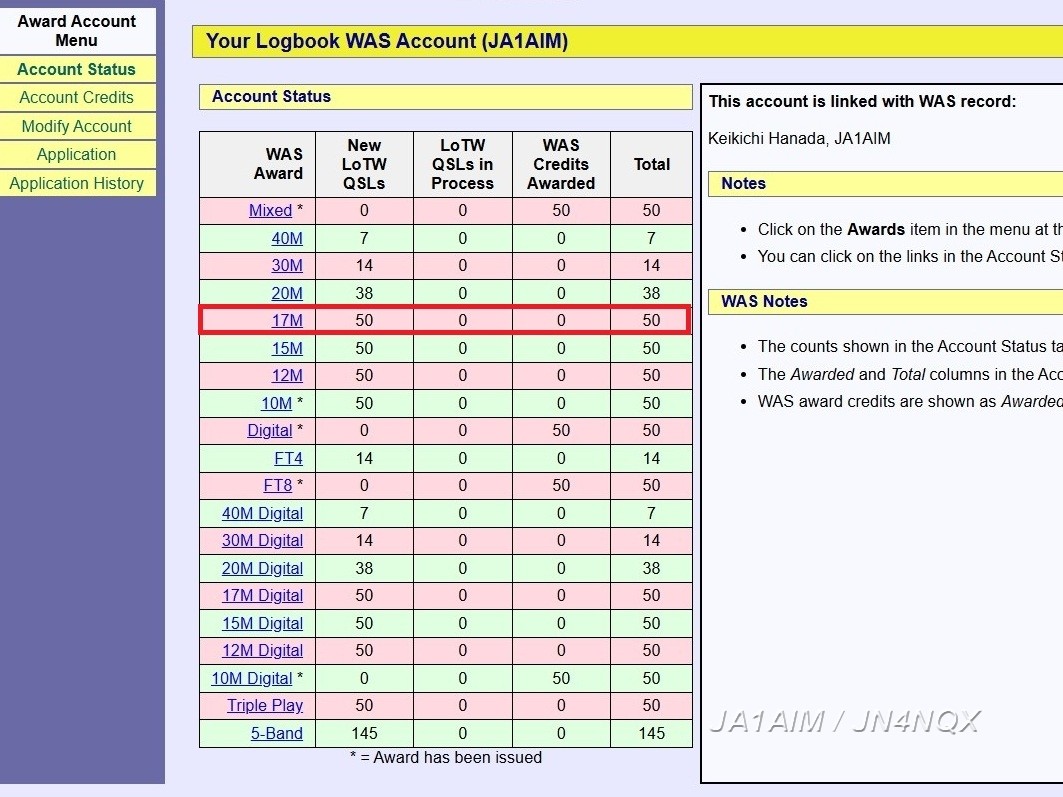 17M(18MHz帯)でのWAS(Worked All States)を達成しました!