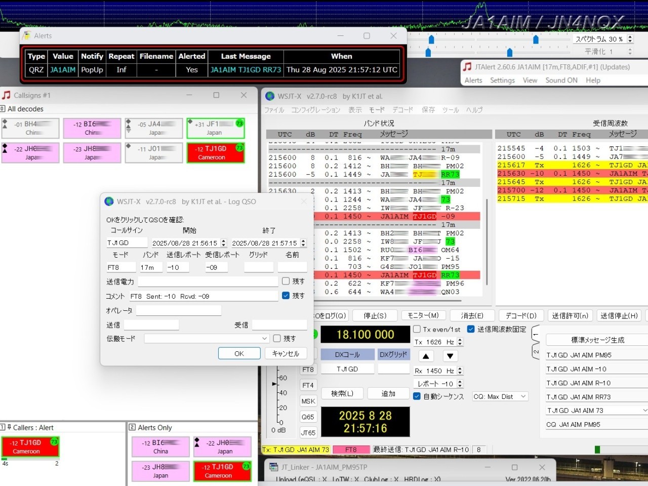 すると、1回目のコールをした直後、JTAlertで設定している赤い表示とベルの音が!