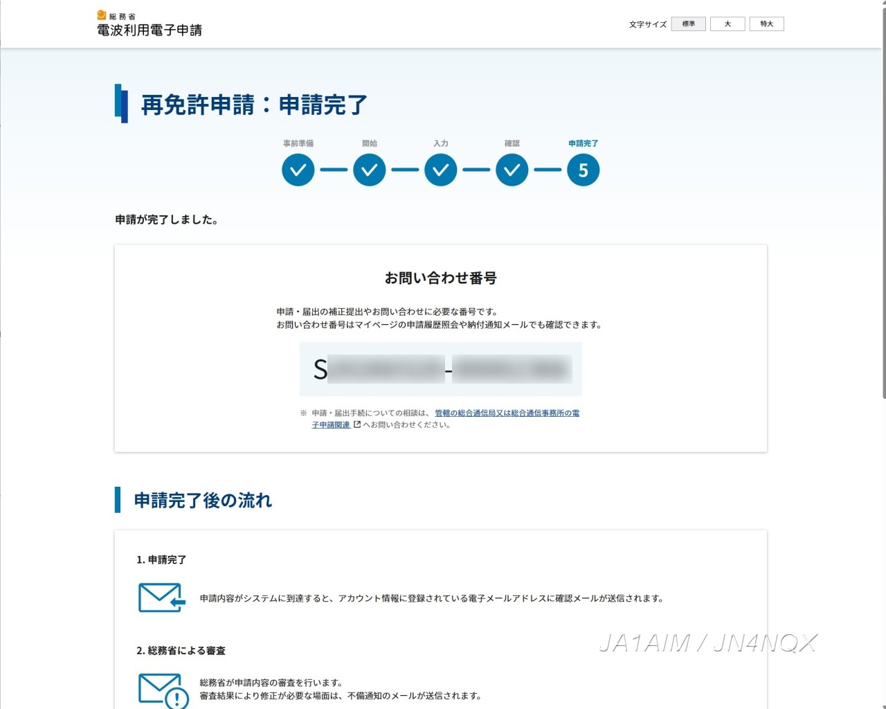 アカウントさえ発行させれば今まで電子申請liteで申請していたこともあり、また、変更事項もないため、なんとものの5分で再免許申請が終了!